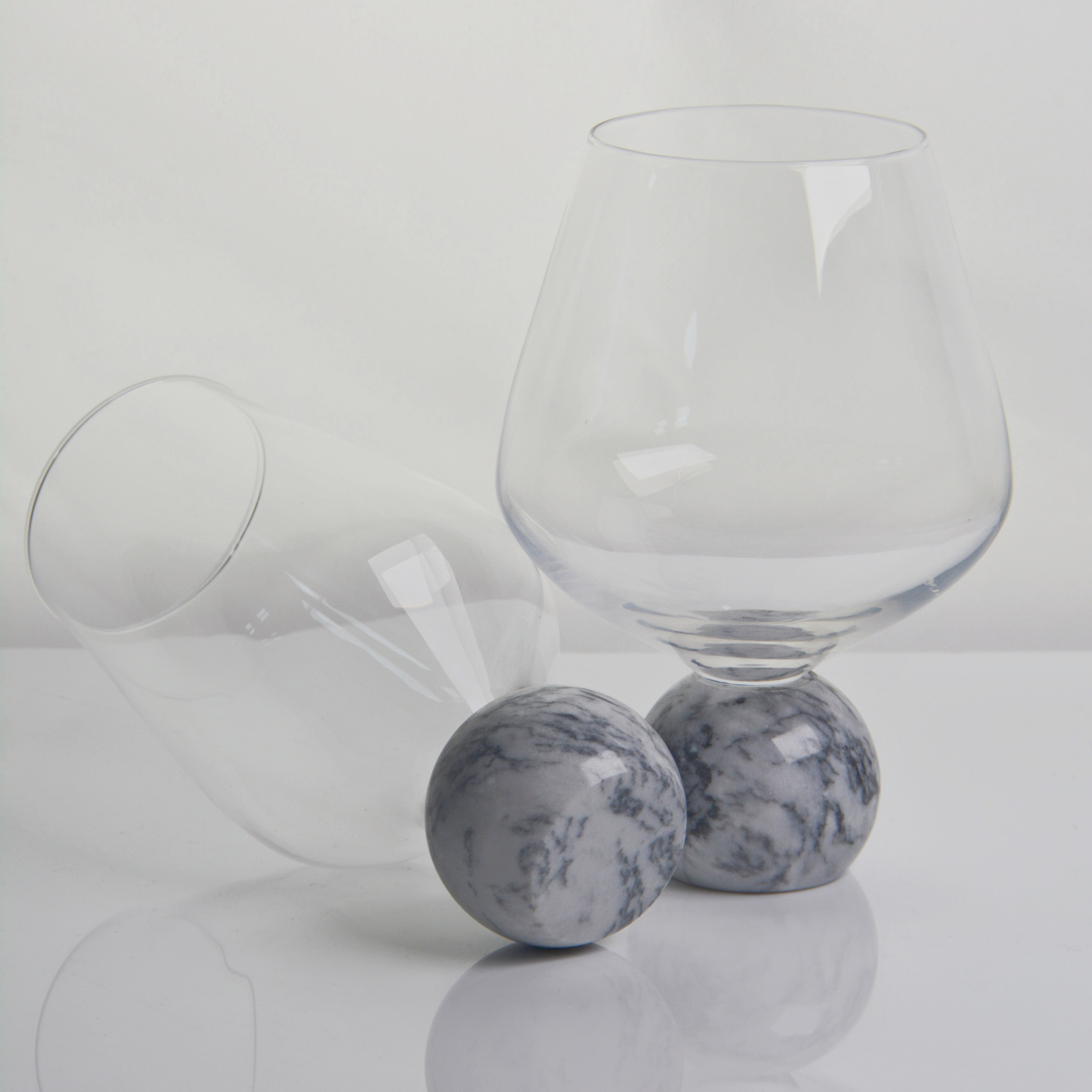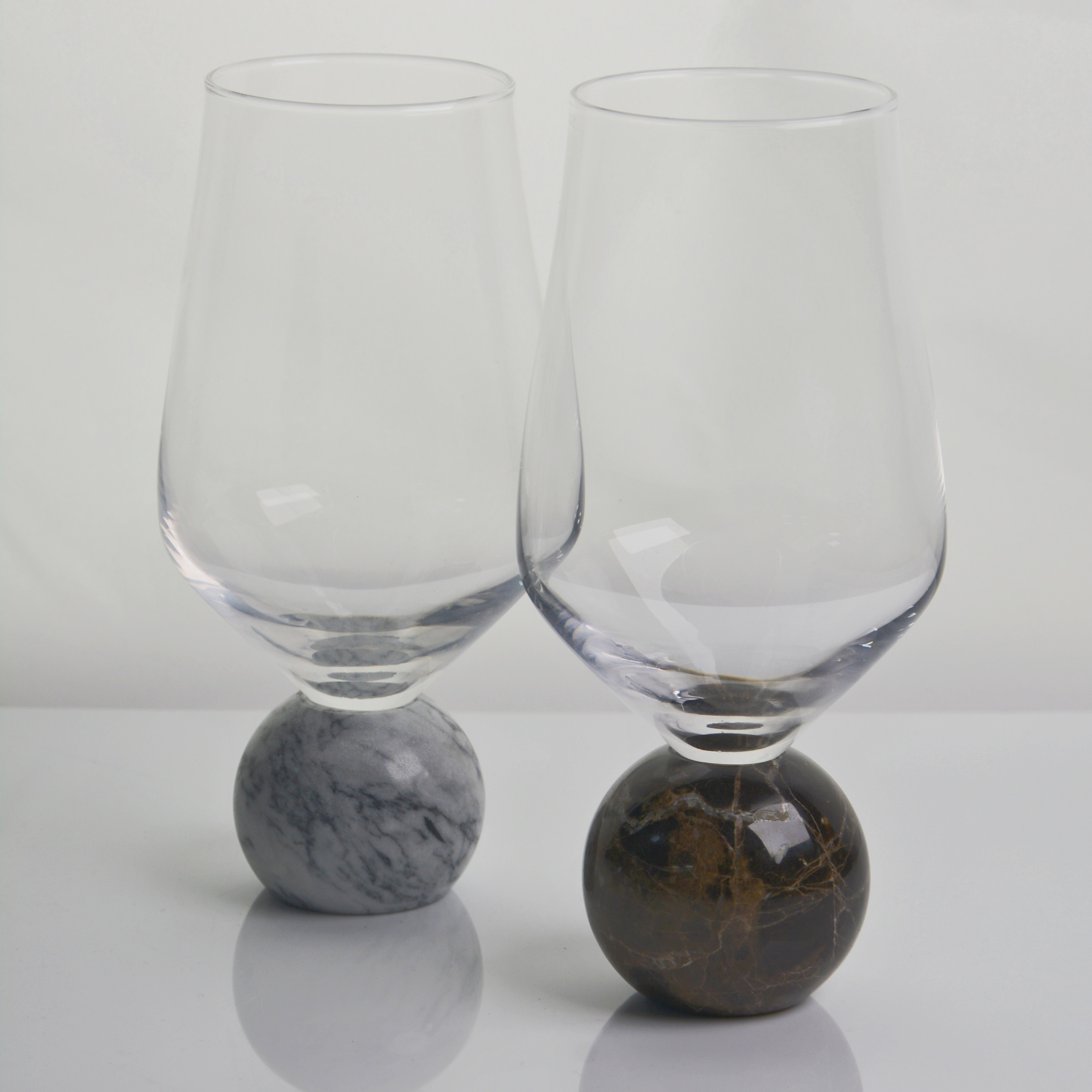 Each glass pairs handblown, ultra-clear crystal with a solid marble sphere base — available in cool gray and warm brown vein patterns — blending natural stone’s earthy elegance with modern, sculptural design.